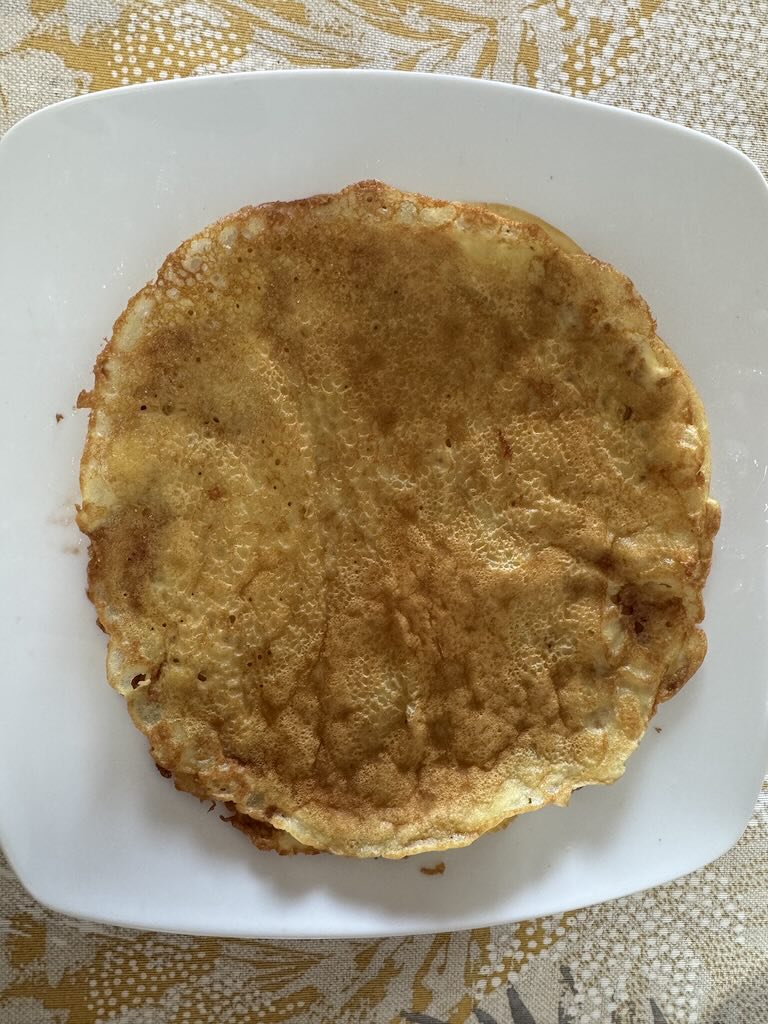 - Die Pfannkuchen sollten auf beiden Seiten eine schöne Bräune erhalten: weder zu dunkel angebrannt, noch zu hell wie ein Crêpe.