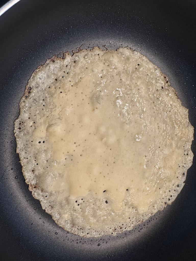 - Teig erst vorsichtig anheben zum wenden, wenn die Oberfläche matt/ trocken wirkt und die Ränder Farbe nehmen.